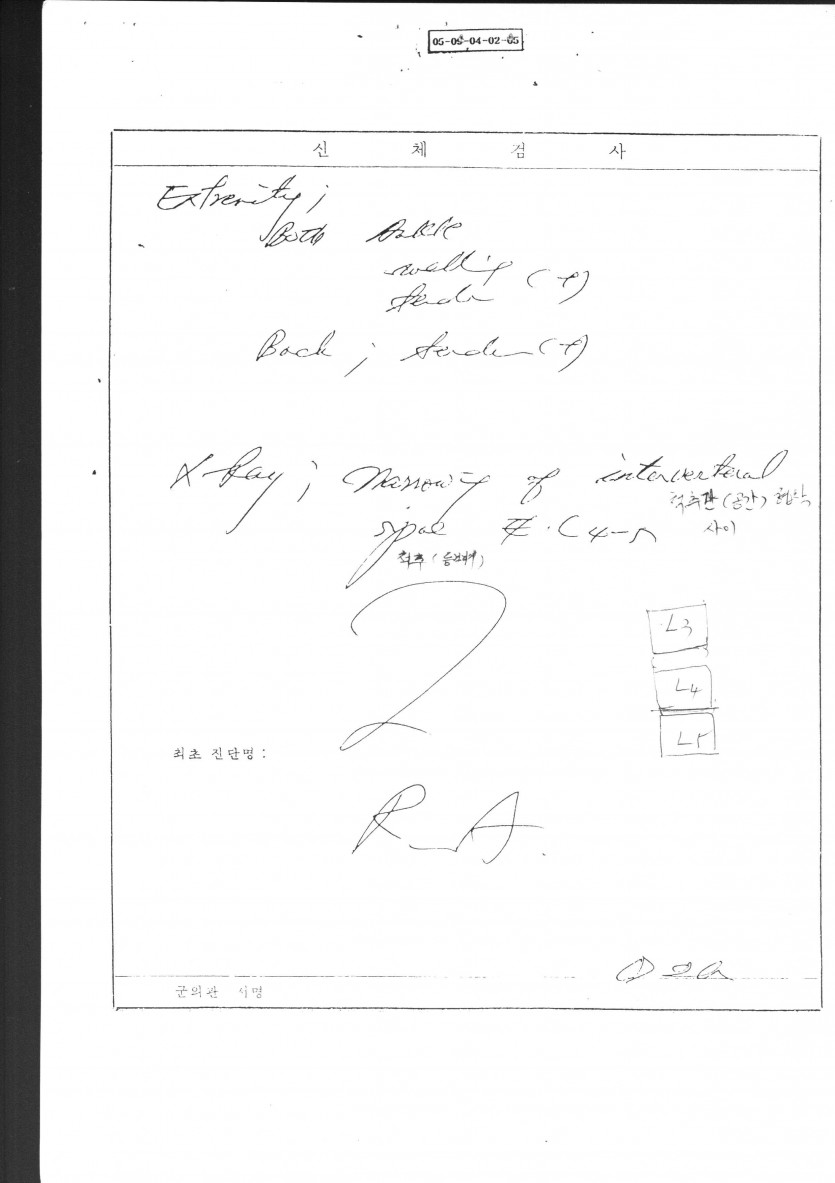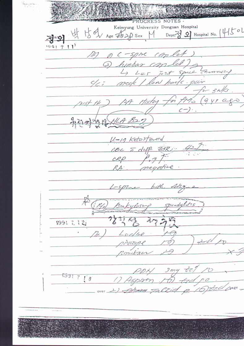 저의 1991년 7월 대구계명대학교동산병원 정형외과 강직성척추염 진단 의무기록지와 1986년 6월 군 병상일지에 이미 척추까지 진행되었다는 진료 기록입니다...KOREA A.S CO